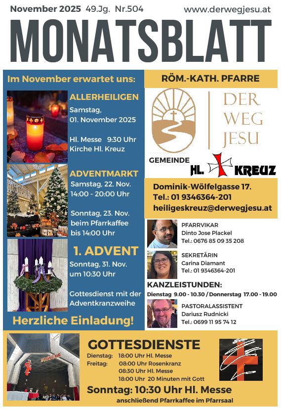 Jeden Dienstag: Abendmesse - 18.00 Jeden Freitag: Rosenkranzgebet - 08.00 Hl. Messe - 08.30 "20 Minuten mit Gott" - 18.00